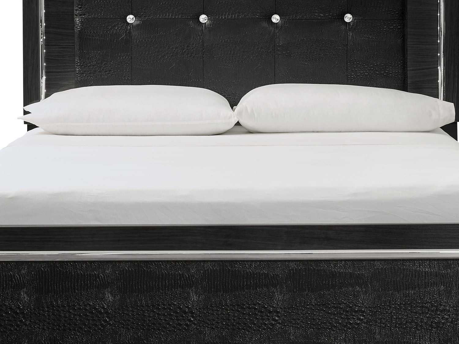 Series Features: Textured faux black gator finish on case fronts, with replicated Walnut wood grain sides. Cases and bed are accented with faceted chrome details. Large scaled chrome handle with faceted details. Headboards are accented with LED lighting and include a remote for color and brightness options. Included remote holder discreetly keeps light remote accessible. Headboards are accented with faux crystal tufted black upholstery. Side roller glides for smooth operating drawers. Drawer interiors are lined with a faux linen laminate for a clean finished look. Both king and queen panel beds have a panel footboard (54,56) and storage footboard option (54S,56S). Queen (57) and king (58) headboards can attach to a bolt-on metal bed B100-31 or B100-66 respectively. Queen (57) upholstered panel headboard is capable of attaching a full sized metal bolt on bed frame. Queen, king/cal king (157,158) upholstered panel headboards feature glitter details accented with LED lighting and include a remote for color and brightness options. Queen (157) and king (158) headboards are compatible with all footboards (54,56,54S,56S) or can attach to a bolt-on metal bed B100-31 or B100-66 respectively. Both USB and wireless charging options are provided with the night stand. Safety is a top priority, clothing storage units are designed to meet the most current standard for stability, ASTM F 2057 (ASTM International). Drawers extend out to accommodate maximum access to drawer interior while maintaining safety.