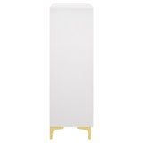 Open up your tight bedroom floor plan with this stately modern glam chest. Five spacious drawers stacked on top of one another keep garments and bedroom essentials stowed away and organized, helping you find what you need fast. A bright, white finish offers a sleek elegance, set off by warm golden accents. Along each of the five drawers is a slender gold finished pull, matched by the golden bracket legs that lift it up. Place this stunning five-drawer chest in your bedroom for an elegantly understated contemporary aesthetic.