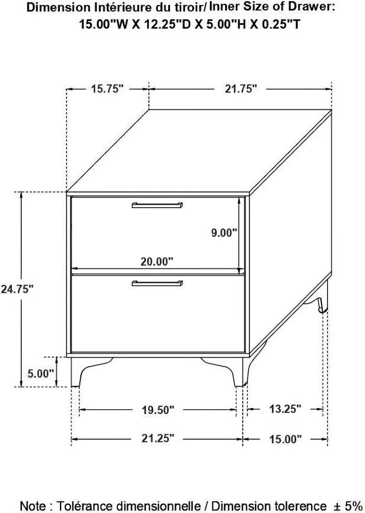 - Nightstand: 21.75"W x 15.75"D x 24.75"H