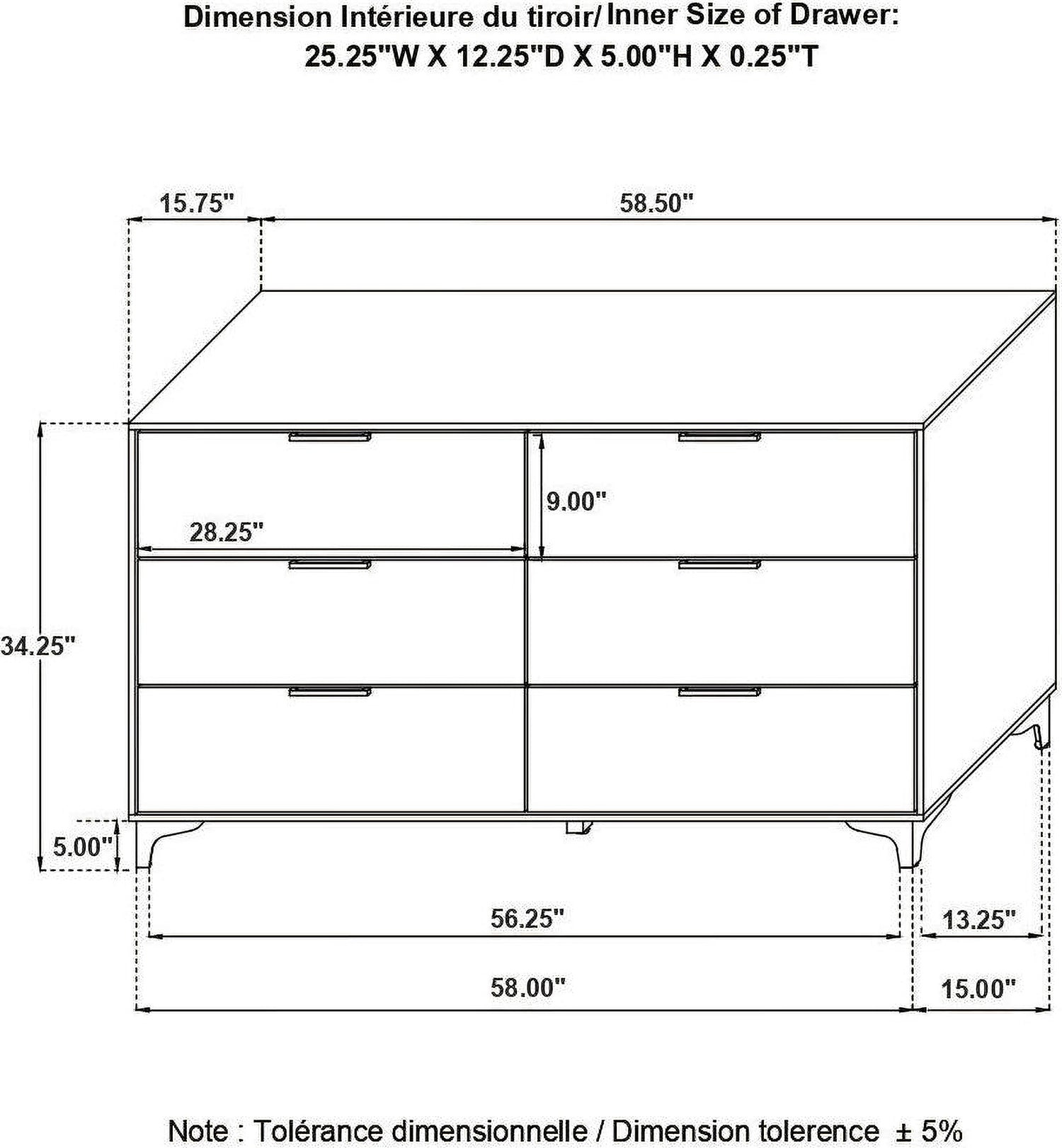 - Dresser: 58.5"W x 15.75"D x 34.25"H
