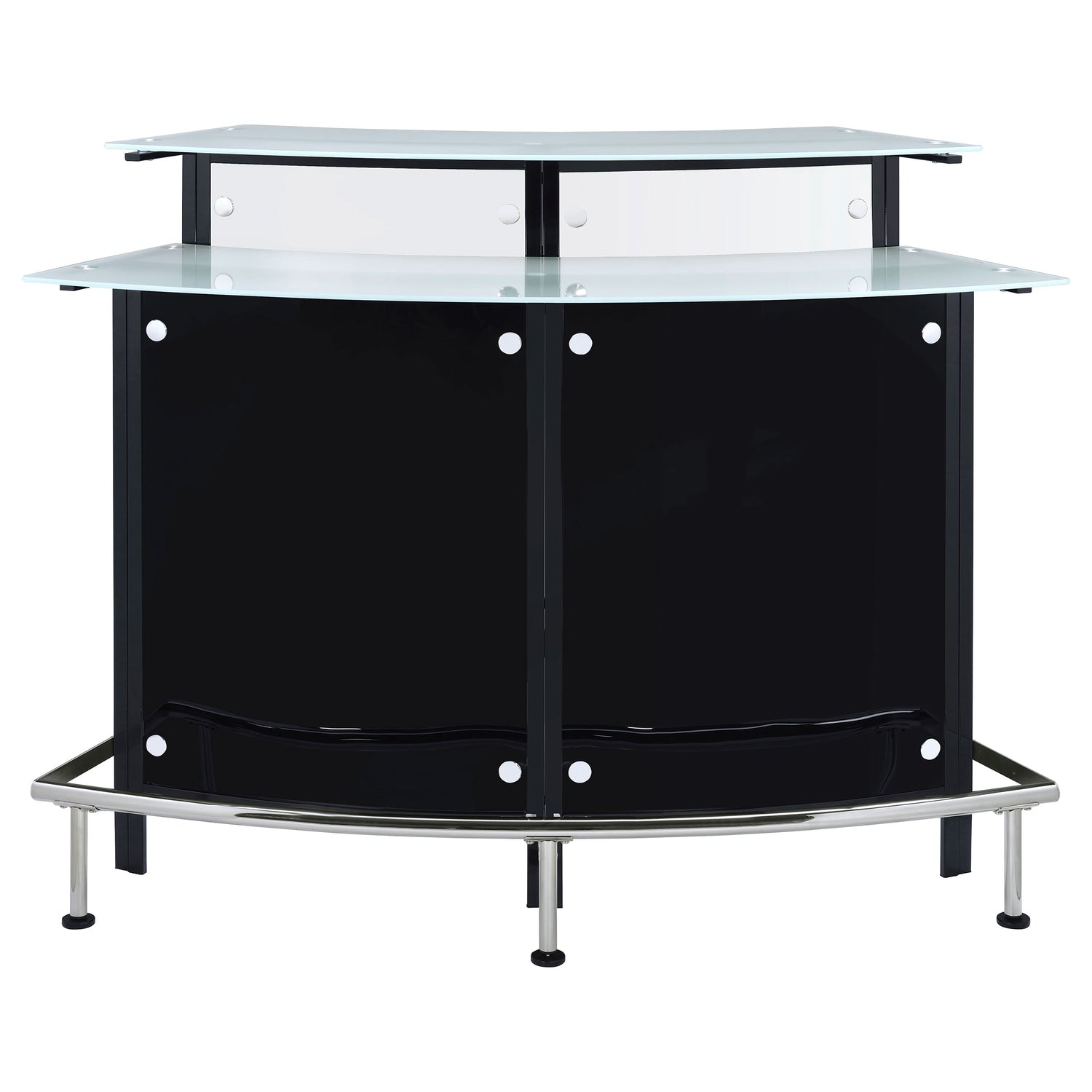 Bring your next cocktail party to life with a stunning statement of glamour. This marvelously modern chrome bar unit lets you show off your mixology skills in style. Place contemporary bar stools of your choice in front of its metal foot rest to give your guests a comfy front row seat as you lavish them with tasty libations. Two separate glass tops provide plenty of space to mix and serve. With striking panels of black and white acrylic and a pleasingly curved silhouette, this charming bar unit looks fabulous in an elegant parlor or lounge.