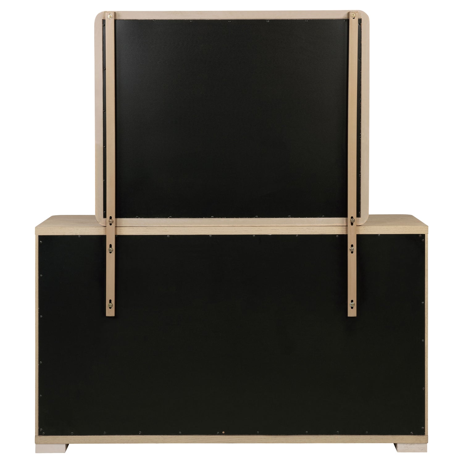 Description: The dresser and mirror set combines function and elegance with its light elm finish and sleek contemporary design. The dresser features six extra-large tinted drawers, each crafted with French and English dovetail construction for durability. Brushed nickel fingertip pulls and rounded corners add refinement, while the matching rectangular mirror completes the look with its clean lines and softly rounded edges, creating a cohesive, modern bedroom ensemble.