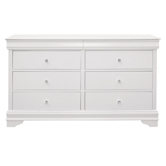 The dynamic appearance of the lana collection is the result of an unexpected junction of traditional design with contemporary styling. a white finish is applied to the dresser in order to highlight the faux alligator embossed drawer fronts, and crystal faceted knob hardware adds an additional wonderful touch. the dresser has secret compartments that provide you with the opportunity to store your own items in an unobtrusive manner.