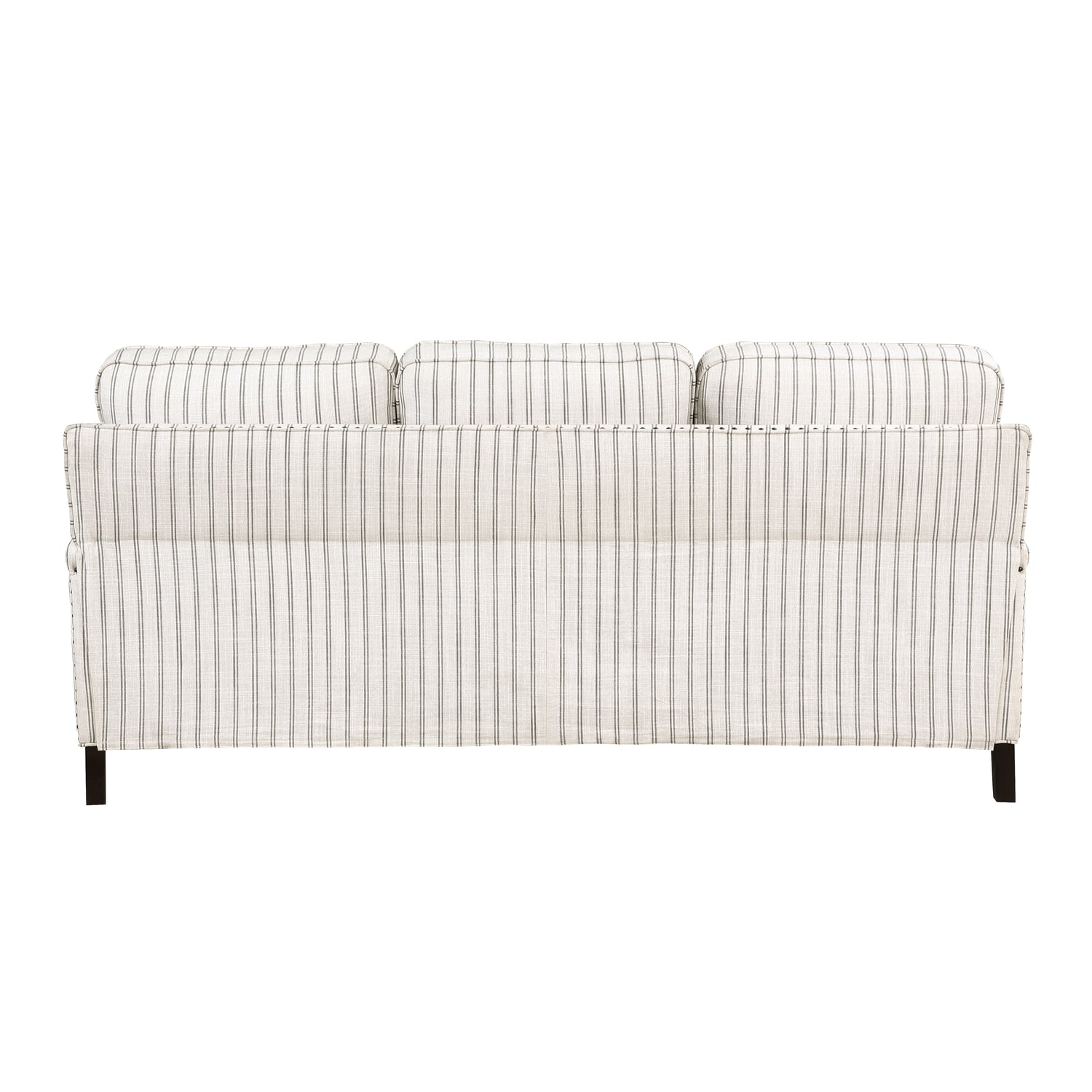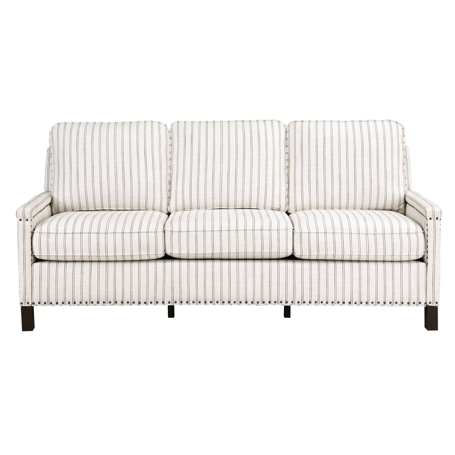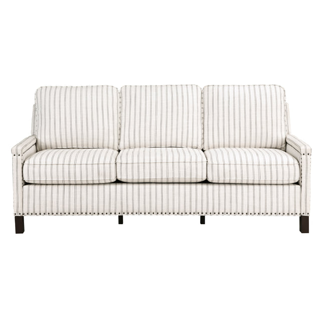 Traditional accents abound in the design of the Landrum Collection, their understated elegance making for classic addition to your living room. Nailhead trim and dark brown finished solid wood legs complement the striped textured fabric that covers the sofa. The reversible backs and seat cushions of the seating group are perfect for your active home.