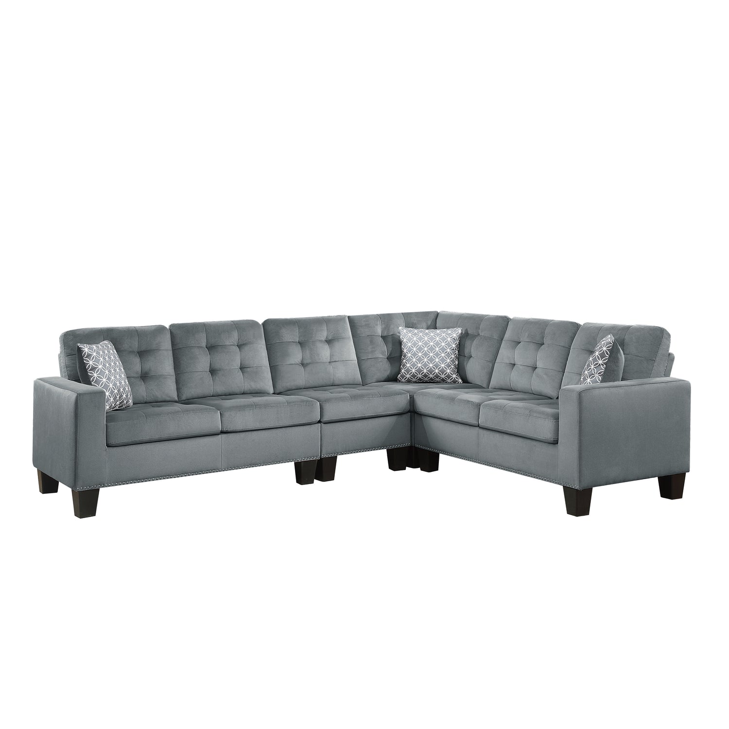 The lantana collection features understated classical styling that gives your home an appearance that is both clean and traditional. your living space can be arranged beautifully thanks to the sectional's flexible layout options. fabric in a gray tone, with pillows in contrasting colors, which enhances the overall look and can be used in a variety of interior decorating schemes.
