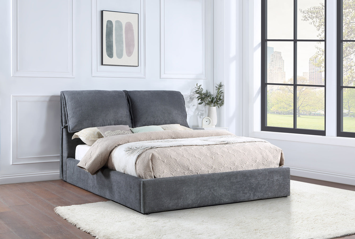 Experience the sophistication of our upholstered bed, harmoniously blending clean lines and an understated silhouette to accentuate organic simplicity. The plush headboard, featuring two oversized pillows secured with tie-offs, provides an inviting space to sit up in bed. Wrapped in a cozy charcoal grey fabric, the elegant side rails and footboard complete the refined aesthetic.