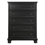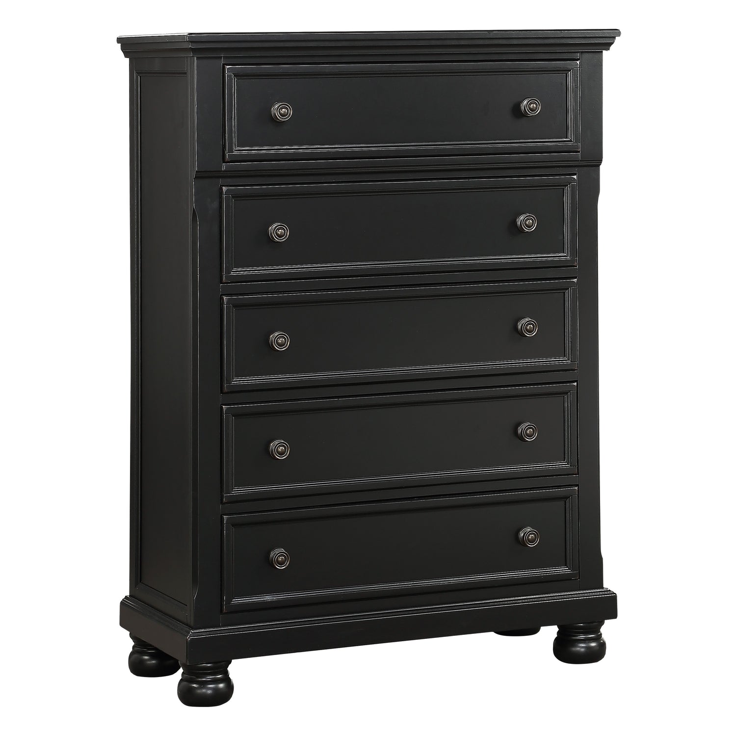 The laurelin collection's casual transitional appearance offers versatility to its use in a number of different bedroom settings, allowing you more design options overall. the black sand-through finish can be either conventional or country casual. the aged bronze knob hardware and bun feet provide support and punctuate the look of each framed drawer front.