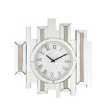 This Lavina irregular wall clock is covered in beveled mirrored panels that highlight its glamorous style. Featuring crushed acrylic faux diamonds that will naturally attract the eye. Durable engineered wood supports the frame. The clock face comes with a timeless roman numeral design.