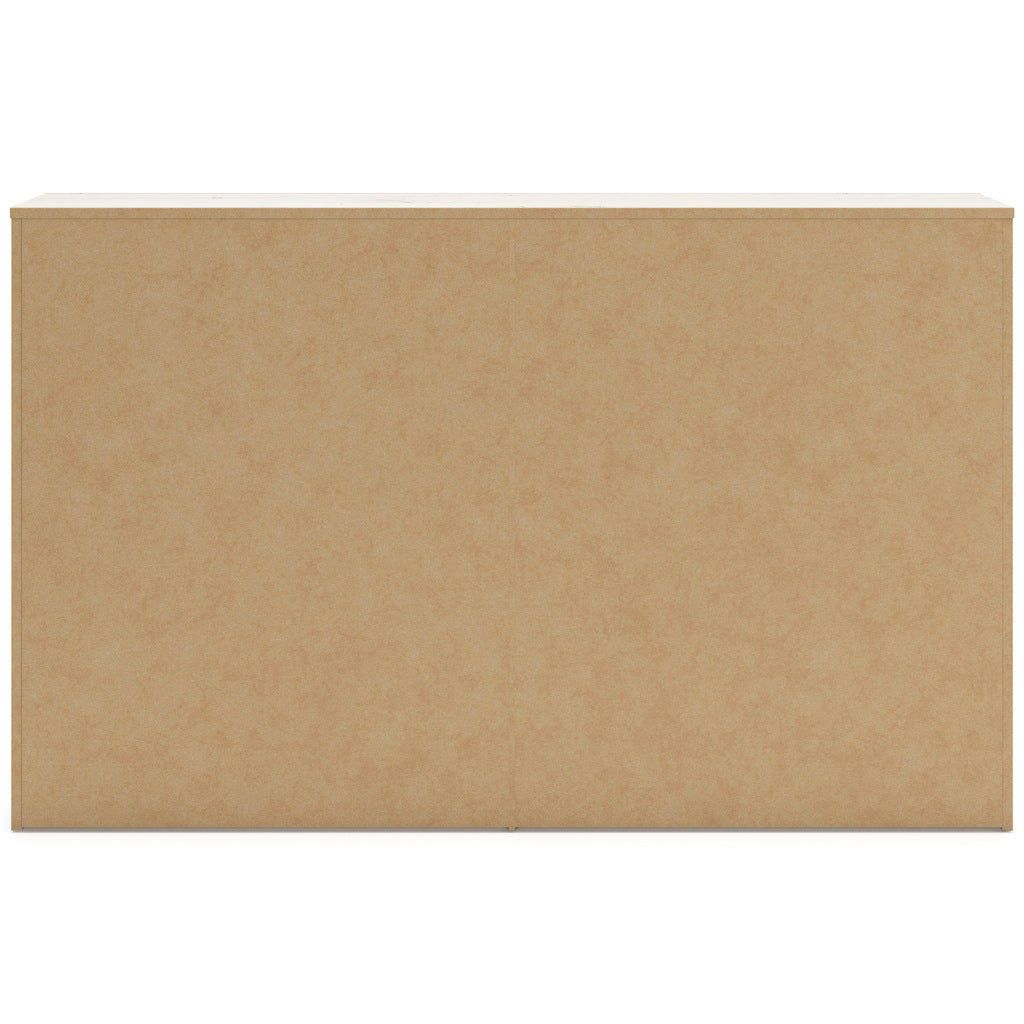 - Drawer interiors are lined with a faux linen laminate for a clean, finished look