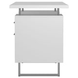 Chic and modern, this wooden writing desk creates a gorgeous focal point in any home office. Sleek lines of silver finished metal create a sturdy foundation for its stylish design. A rectangular, floating tabletop adds visual intrigue to its clean silhouette. A storage cabinet, drawer, and file cabinet keep office essentials organized with ease. Available in your choice of attractive colors, there's an elegant option to effortlessly match with your space.