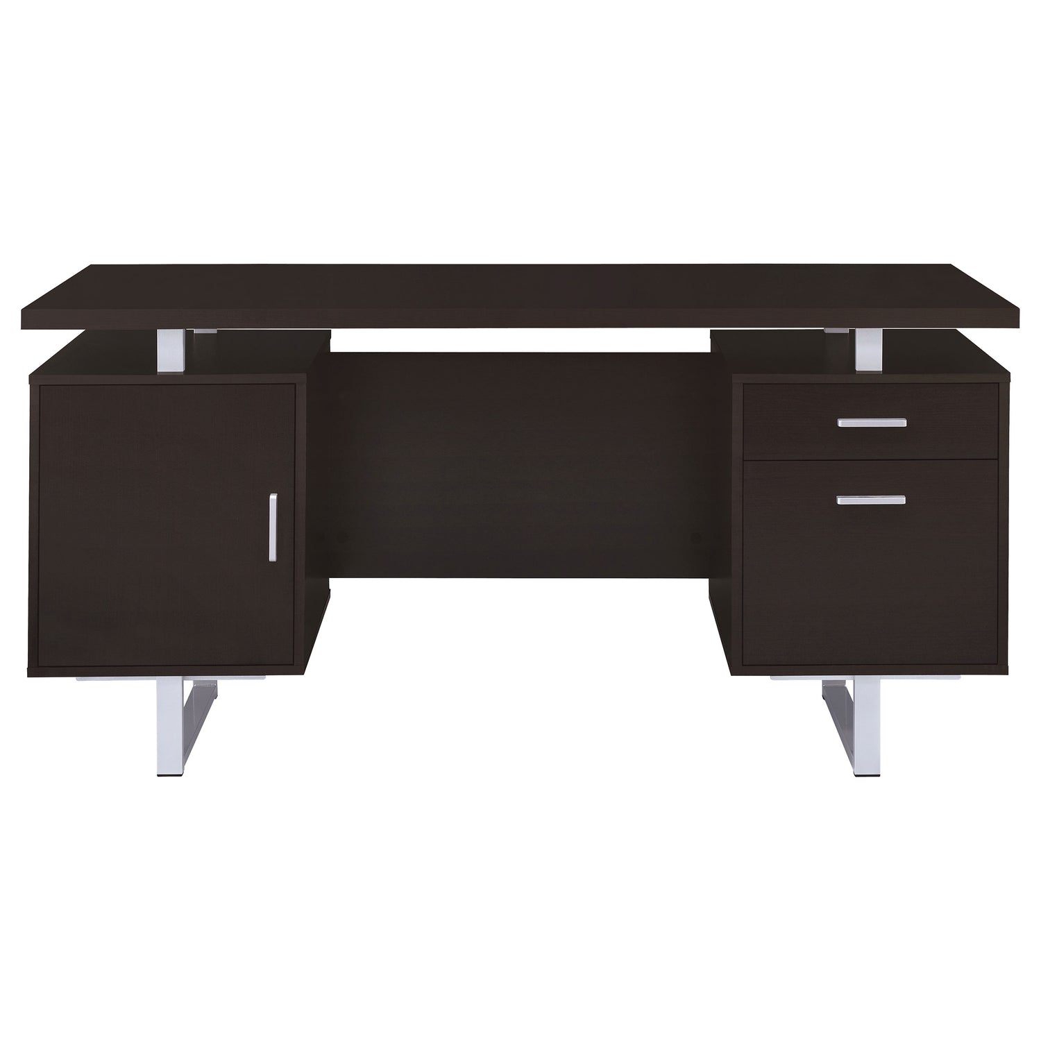 Enjoy an intriguing architectural design in this office desk. A floating top creates a visually enticing effect and a completely different look. Finished in cappuccino, it flatters surrounding decor and delivers a dramatic touch. Store essentials in a cabinet and drawer, and use a file cabinet to organize papers. Contrasting silver hardware and steel legs plays up the contemporary flavor of this stylish desk.