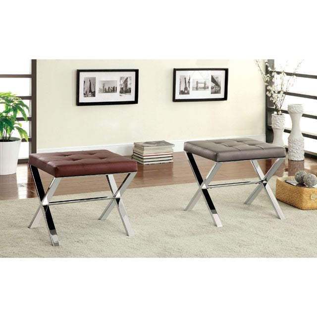 This striking bench features a tufted seat and chrome base, which makes it a perfect piece for a contemporary setting. The sleekness of the X-shaped metal base is balanced out by the warm, earth-tones.