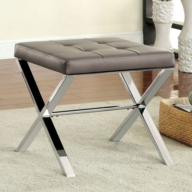 This striking bench features a tufted seat and chrome base, which makes it a perfect piece for a contemporary setting. The sleekness of the X-shaped metal base is balanced out by the warm, earth-tones.
