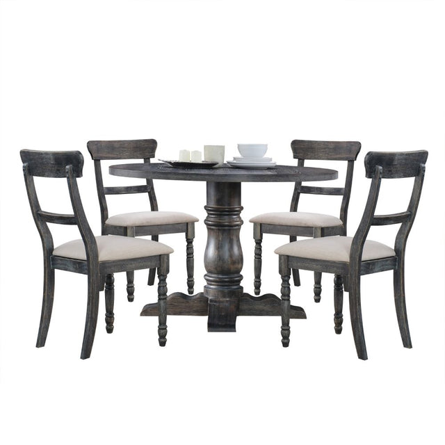 The Leventis Collection is a great choice for those who want a modern look with traditional design elements. It features a weathered gray finish and a single pedestal, making it perfect for any dining room. The table top has plenty of space to spread out, and the pedestal makes it easy to slide into. The cushioned seats on the matching chairs make them comfortable to sit on and complete the whole look.