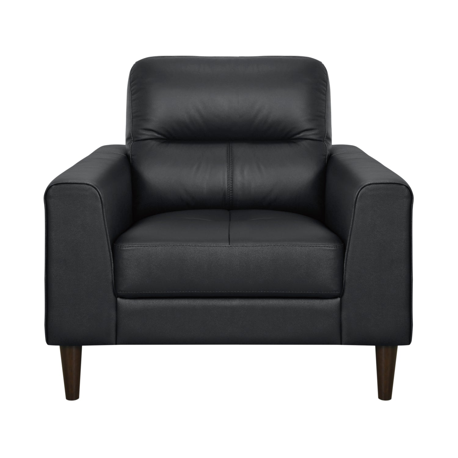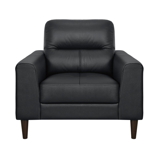 Modern comfort is paired with retro lines to create the design of the Lewes Collection. Covering the chair is black 100% top grain leather where the body touches, while all other areas feature faux leather. Track arms and contoured seating lend to the versatile modern look. Supporting the chair are solid wood legs with a brown finish.