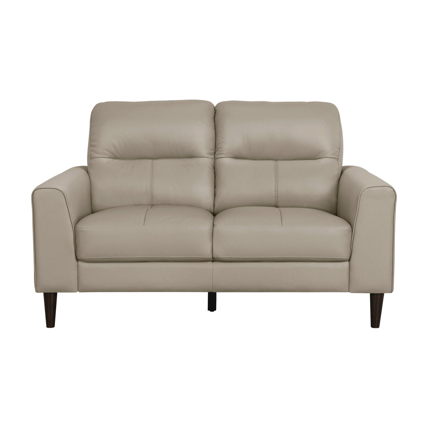 Modern comfort is paired with retro lines to create the design of the Lewes Collection. Covering the love seat is Latte-hued 100% top grain leather where the body touches, while all other areas feature faux leather. Track arms and contoured seating lend to the versatile modern look. Supporting the love seat are solid wood legs with a brown finish.
