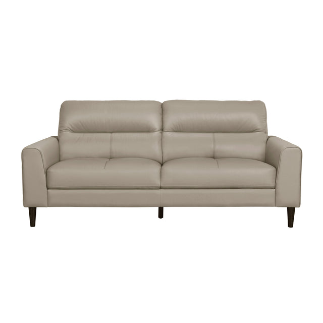Modern comfort is paired with retro lines to create the design of the Lewes Collection. Covering the sofa is Latte-hued 100% top grain leather where the body touches, while all other areas feature faux leather. Track arms and contoured seating lend to the versatile modern look. Supporting the sofa are solid wood legs with a brown finish.