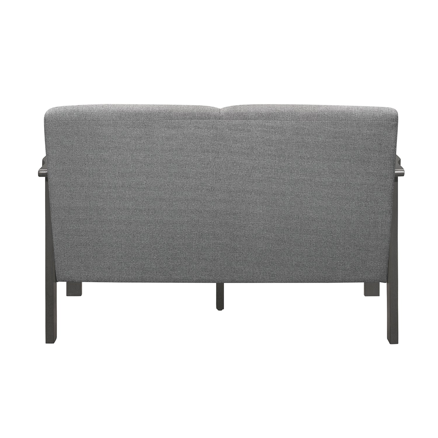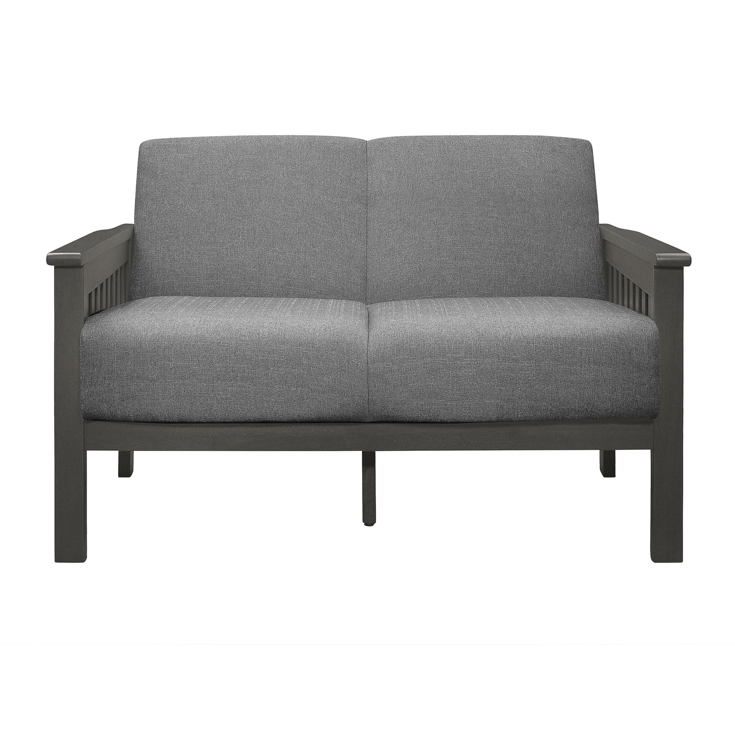 The lewiston collection will be a timelessly elegant addition to the furnishings in your home because it was designed using cues from the arts and crafts movement. the transitionally styled legs of the love seat and the vertical slat-supported wood arms both have an antique gray finish, which provides a complimentary contrast to the gray linen-like fabric that covers the love seat.