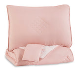 Bring a sophisticated look to your bedroom with this comforter set. Featuring a solid pink background with a stitched diamond design, the comforter reverses to a crisp and fresh arrow design in pink, white and gray—giving you the choice to change up your bedroom decor quickly and easily.