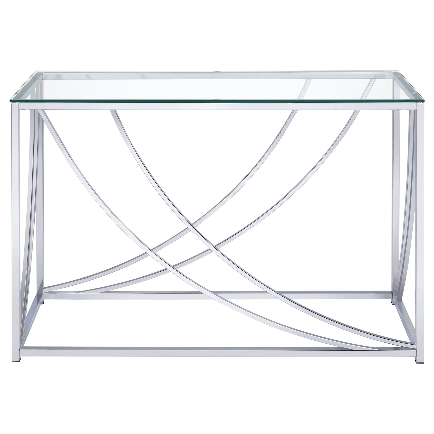 Full of clean lines and swooping curves, this modern sofa table adds depth to any living room or entryway. Bright and radiant, a shiny chrome finish dresses up the simple lines of the frame. The contemporary design of the decorative accents sets the smooth silhouette apart from the rest. Revel in the luxury and structure of the combination of a metallic base topped with glass. Create a visual focal point with the textures from this charming table.