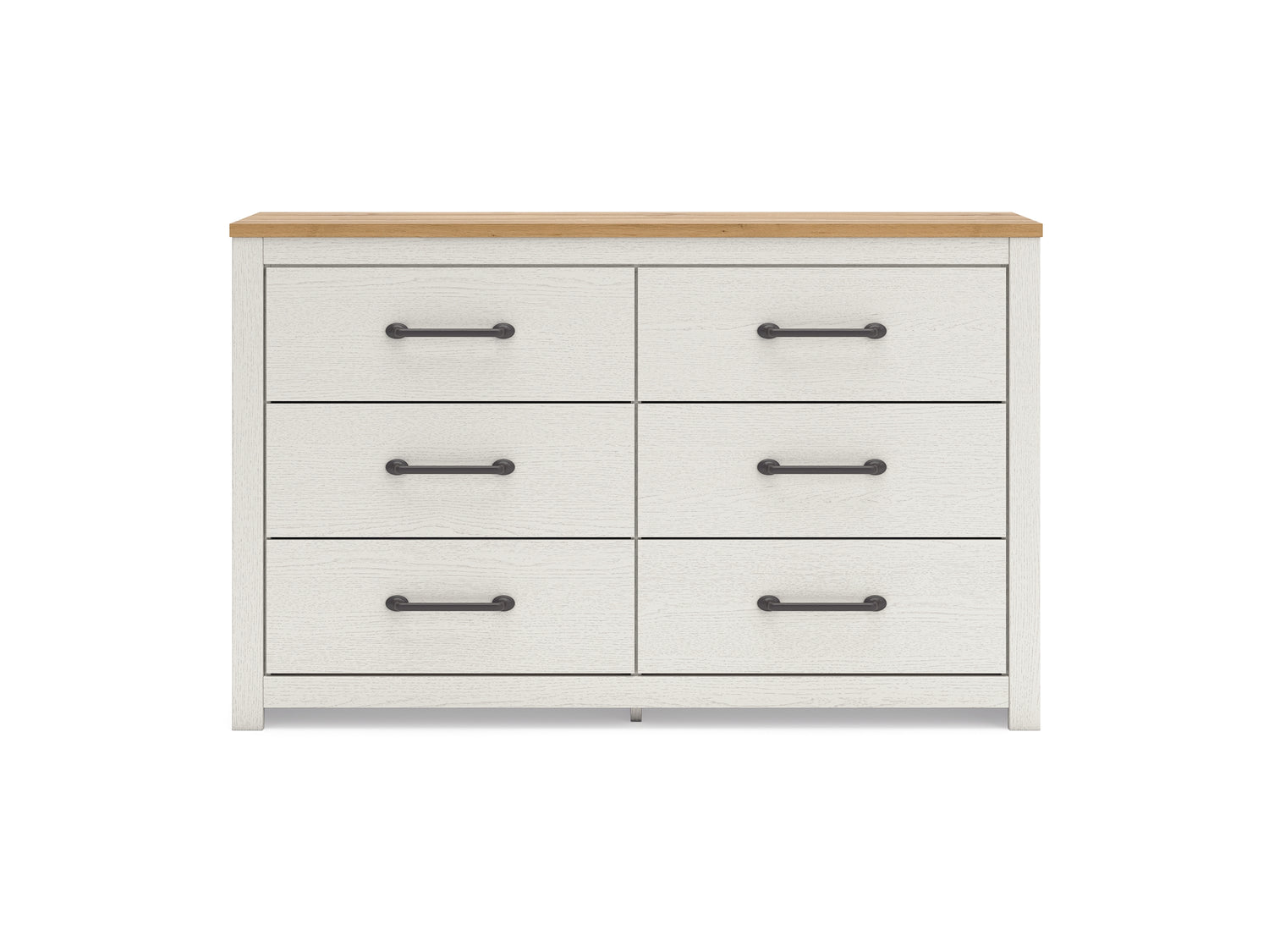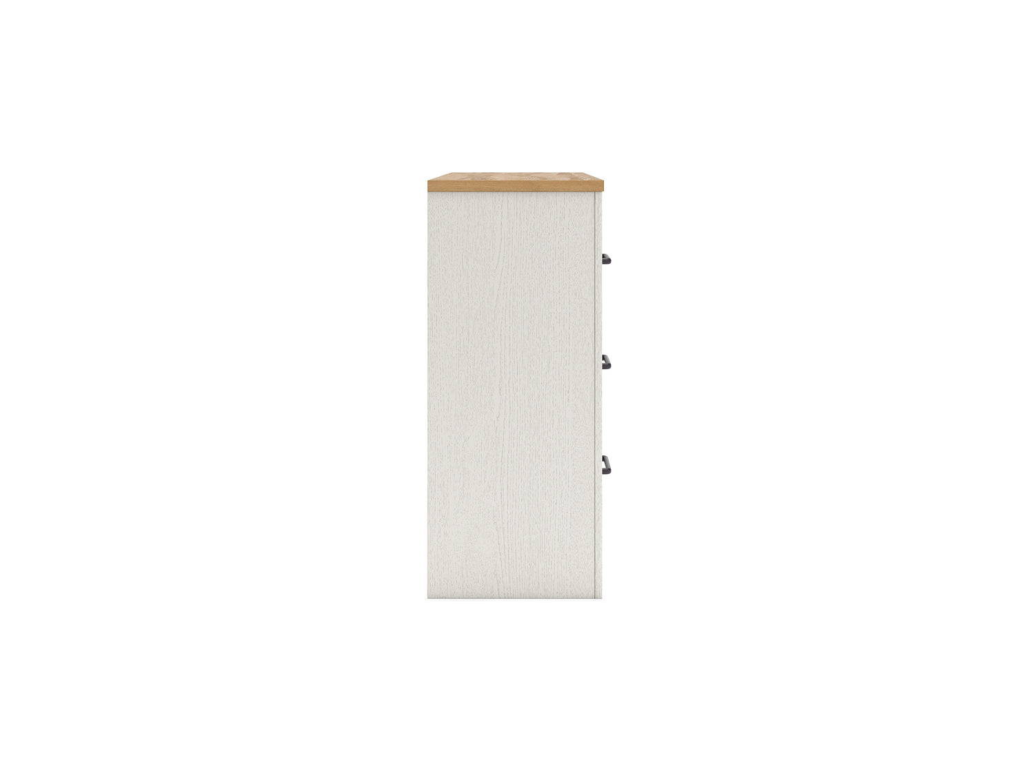 Series Features: White painted finish with a subtle replicated wood grain accented with warm finish replicated Oak grain with authentic touch. Cases feature a framed front and pilasters. Contemporary handles in a dark pewter color finish. Side roller glides for smooth operating drawers. Drawer interiors lined with a replicated linen design for a clean, finished look. Queen (57) and king (58) headboards can attach to a bolt-on metal bed frame B100-31 or B100-66 respectively. Mirror (36) has the versatility to be mounted on dresser or wall horizontally or vertically. Safety is a top priority, clothing storage units are designed to meet the most current standard for stability, ASTM F 2057 (ASTM International). Drawers extend out to accommodate maximum access to drawer interior while maintaining safety.