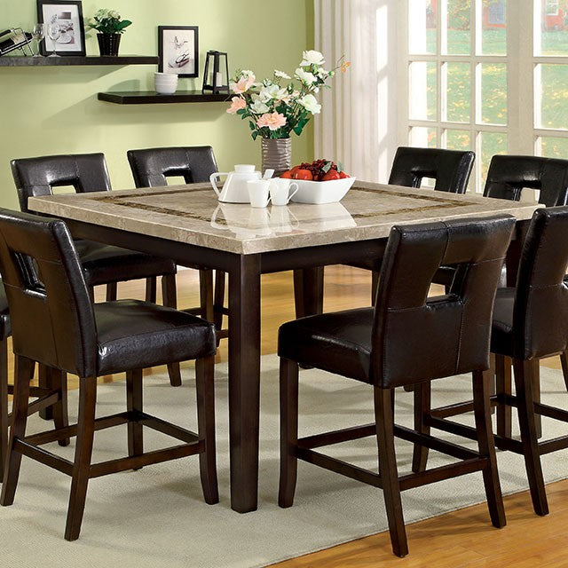 For smaller kitchens or dining rooms this square marble top counter height table seats eight comfortably. A round table top option is also available and seats four. Mix with the button tufted or key-hole style padded leatherette chair.