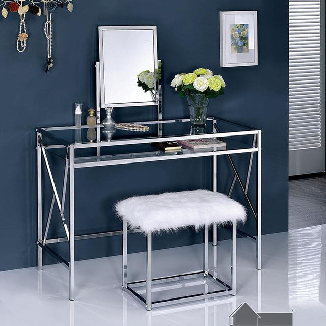 Indulge in the finer things with this contemporary style vanity set. The chrome base blends with the clear tempered glass top for an ultra-chic look that is both functional and stylish. The glam continues with a white padded fur stool that is beyond adorable!