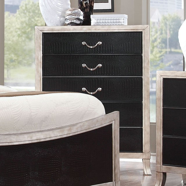 Contrast defines this elegant chest: flowing lines are set against straight edges, while the smooth silver finish clashes beautifully with the textured, crocodile leatherette front panels. Legs curve gently outward away from the straight frame, while antique-looking handles exhibit curves as well.