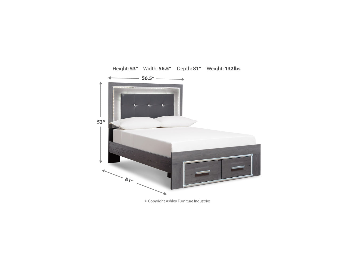 Series Features: Modern gray finish with replicated wood grain. Cases and bed are accented with faceted chrome details. Large scaled chrome handle with faceted details. Headboards are accented with LED lighting and include a remote for color and brightness options. Included remote holder discretely keeps light remote accessible. Headboards are accented with faux crystal tufted black upholstery. Side roller glides for smooth operating drawers. Drawer interiors are lined with a faux linen laminate for a clean finished look. Both king, queen and full panel beds have a panel footboard (84,54,56) and storage footboard option (84S,54S,56S). Full (87), Queen (57) and King (58) headboards can attach to a bolt-on metal bed B100-21, B100-31 or B100-66 respectively. Queen (57) upholstered panel headboard is capable of attaching a full sized metal bolt on bed frame. Both USB and wireless charging options are provided with the night stand. Queen (54,54S) and king (56,56S) can use -95 platform rails and require B100-13 (queen) or B100-14 (king) roll slats eliminating the need for a box spring. Safety is a top priority, clothing storage units are designed to meet the most current standard for stability, ASTM F 2057 (ASTM International). Drawers extend out to accommodate maximum access to drawer interior while maintaining safety.