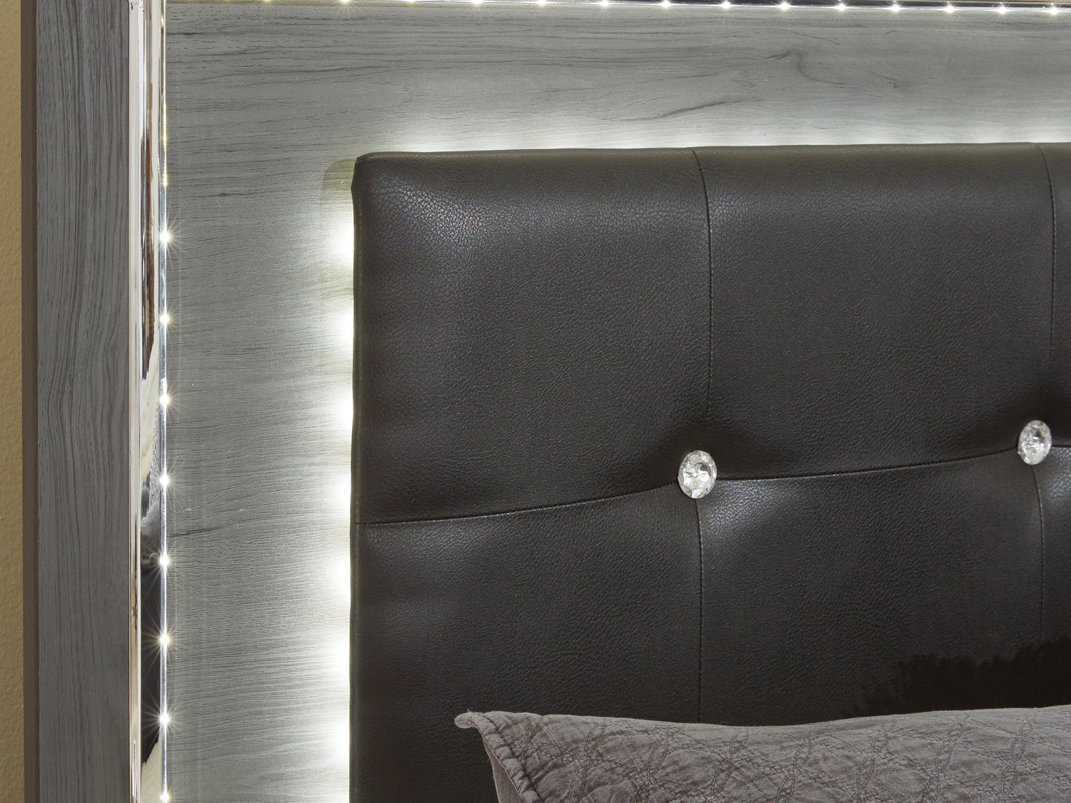 Series Features: Modern gray finish with replicated wood grain. Cases and bed are accented with faceted chrome details. Large scaled chrome handle with faceted details. Headboards are accented with LED lighting and include a remote for color and brightness options. Included remote holder discretely keeps light remote accessible. Headboards are accented with faux crystal tufted black upholstery. Side roller glides for smooth operating drawers. Drawer interiors are lined with a faux linen laminate for a clean finished look. Both king, queen and full panel beds have a panel footboard (84,54,56) and storage footboard option (84S,54S,56S). Full (87), Queen (57) and King (58) headboards can attach to a bolt-on metal bed B100-21, B100-31 or B100-66 respectively. Queen (57) upholstered panel headboard is capable of attaching a full sized metal bolt on bed frame. Both USB and wireless charging options are provided with the night stand. Queen (54,54S) and king (56,56S) can use -95 platform rails and require B100-13 (queen) or B100-14 (king) roll slats eliminating the need for a box spring. Safety is a top priority, clothing storage units are designed to meet the most current standard for stability, ASTM F 2057 (ASTM International). Drawers extend out to accommodate maximum access to drawer interior while maintaining safety.