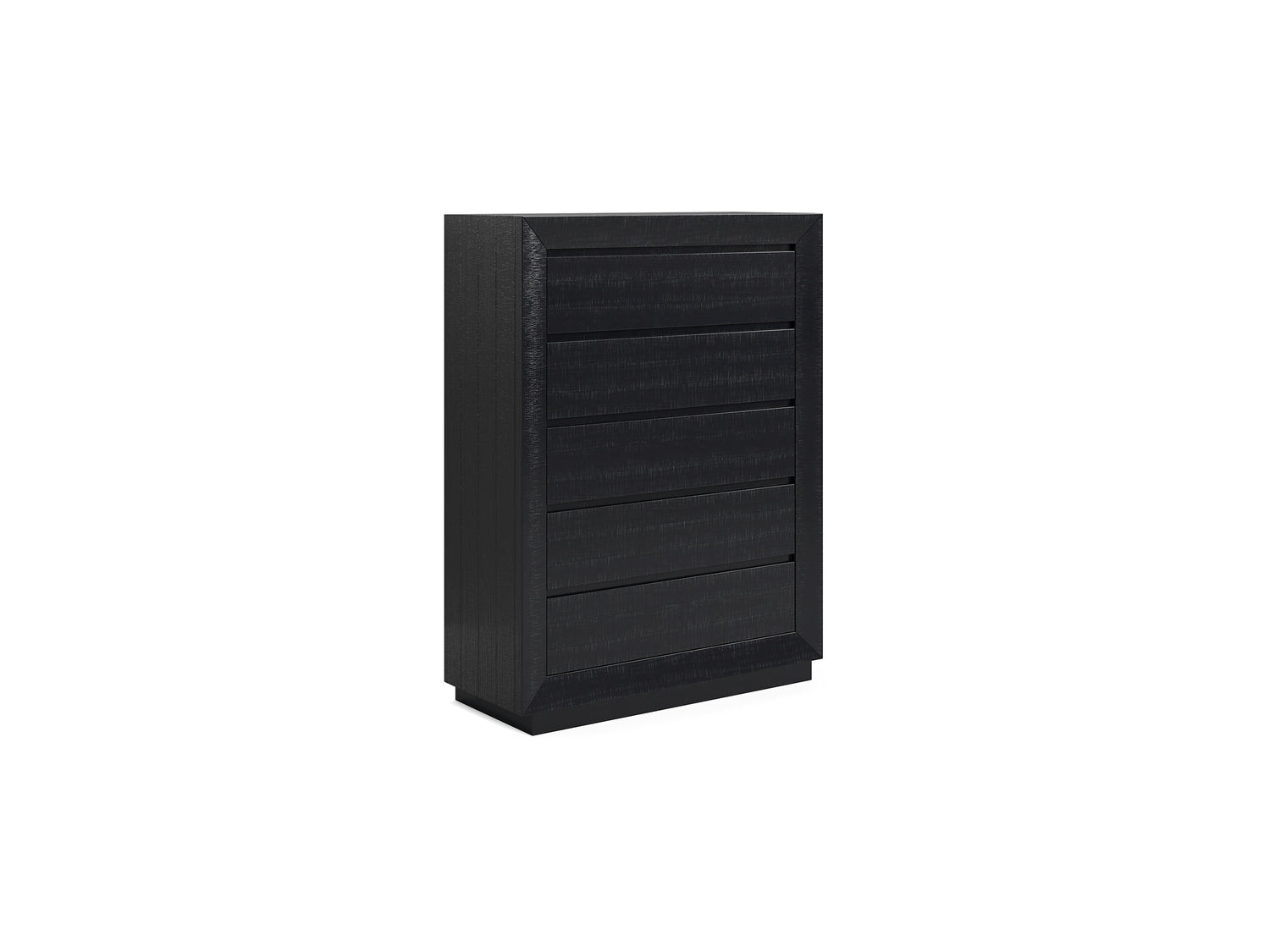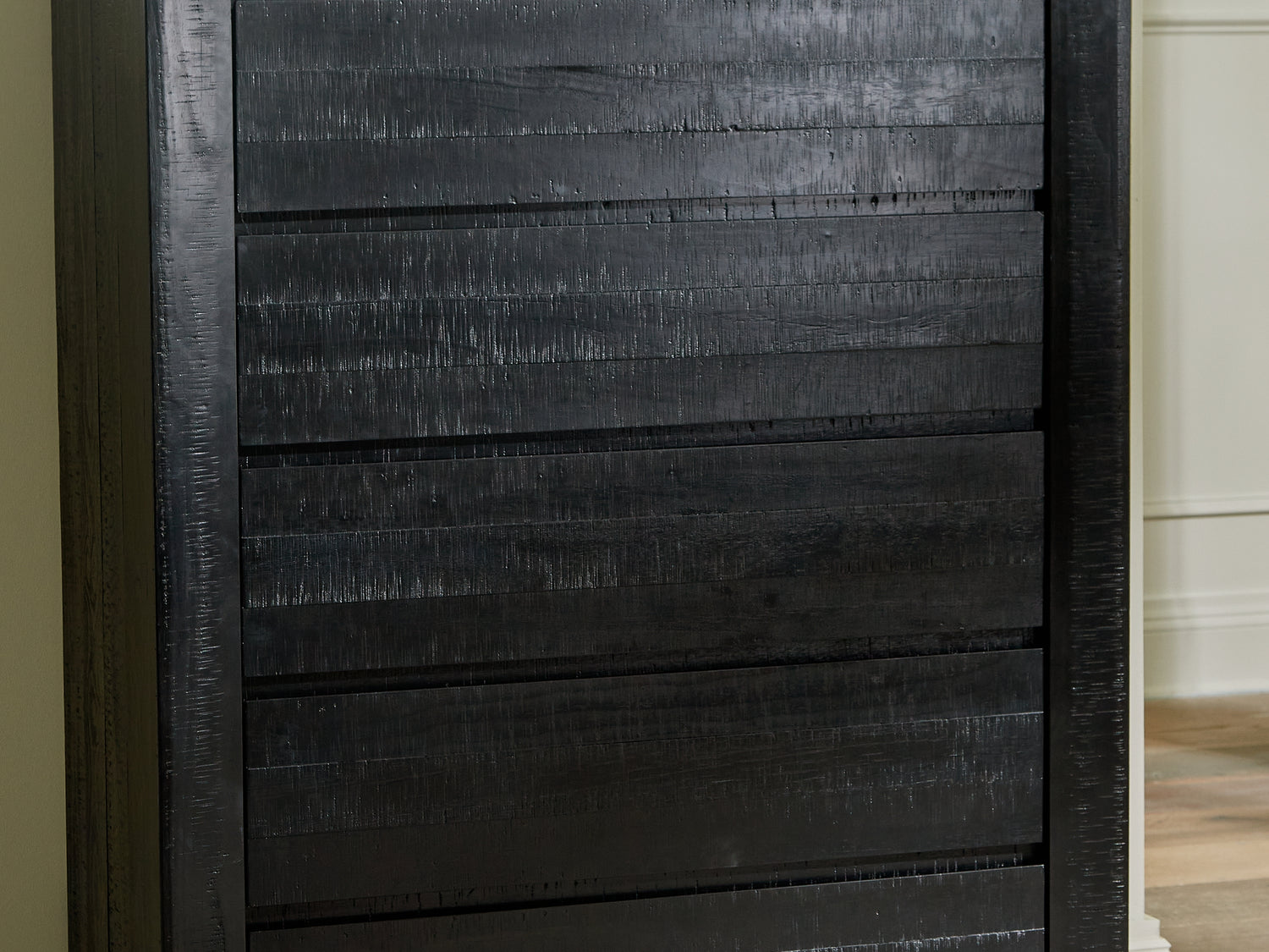 Series Features: Urban Contemporary styling. Made with Pine solids and veneers with engineered wood substrate. A deep black wood stain with waxy top coat over a heavily distressed surface offers a uniquely casual feel. The hardware less design places emphasis on the beautifully textured wood surface. Fully finished drawer interiors with dovetailed construction and ball-bearing side glides. Upper drawers feature felt bottoms. The all wood platform bed features extra wide rails for a bench-like wrap around. Two drawer nightstand includes a 110V power supply with dual USB charging ports.