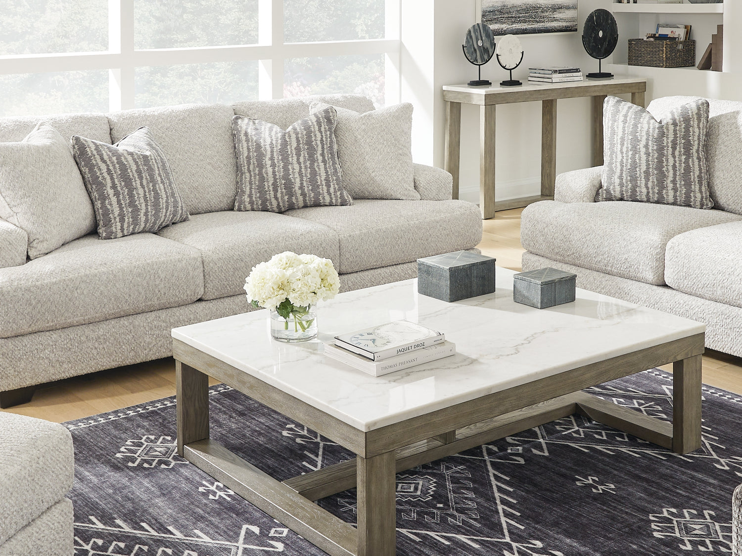 Series Features: Casual lifestyle design. Made with Oak veneer and MDF substrate with natural marble tops. Finished with a trend-right grayish brown wood-tone. The oversized cocktail table with its stylish yet simple design is ideal for large sectional family room settings. Matching end table.