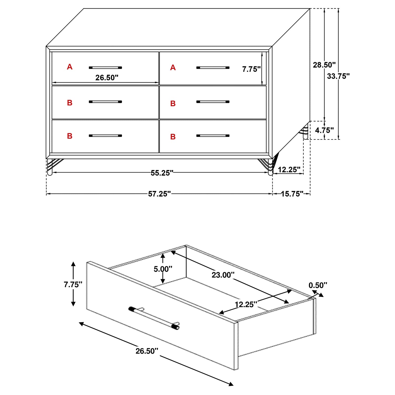 Effortlessly blending inviting softness and timeless sophistication, this four-piece modern bedroom set creates a rich but inviting ambiance. It centers on a stylish upholstered bed that pairs beige upholstery with a fluted look, creating impressive texture and dimensionality. Its on-trend silhouette encourages an open, airy feeling, complete with understated rails and footboard. The set includes a two-drawer nightstand and six-drawer dresser and mirror combination, creating a stylish set that brims with elegance. The cases features a bright white finish, while each piece is trimmed in gold, offering gleaming warmth and sophistication.