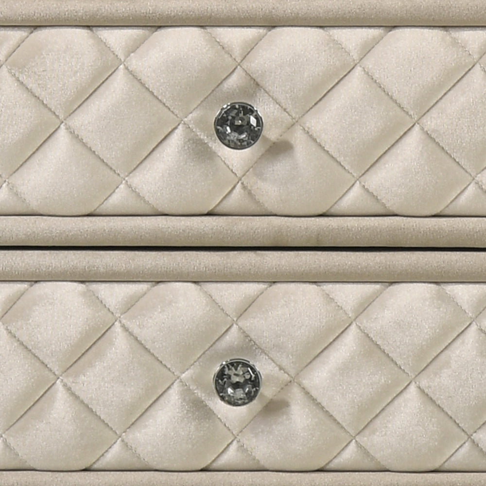 Our luxurious Lucienne nightstand is designed to elevate your bedroom to the next level of sophistication and glamour. This stunning nightstand is expertly crafted with attention to detail and quality. Upholstered in a luxurious beige velvet fabric, adding a touch of opulence and glamour to the overall design. Featuring quilted drawer fronts with crystal-like knobs. This nightstand boasts two drawers and a convenient pull-out tray, perfect for keeping your bedside essentials close at hand. The bun legs add a touch of classic elegance, creating a unique and sophisticated look that will enhance any decor.