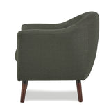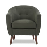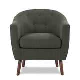 With the lucille collection's mid-century modern inspired lines, retro lines are no longer relegated to the past where they belong. the grey fabric chair has a curved chair back that is accented with button-tufted detailing, and it also has tastefully appointed cherry finished wood legs, offering an appearance that provides insight into your traditional sense of personal style. additional fabric options that vary from understated to daring, including shades of beige, blue, and orange.