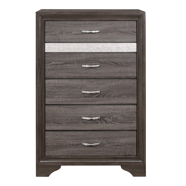 Your bedroom may be transformed into a luxurious retreat with the help of the luster collection's distinctive design. the embossed faux-wood veneer on the chest has a gray finish, which makes the acrylic silver glitter front of the secret jewelry drawer stand out beautifully. the interior of the jewelry drawer is lined with felt, which prevents damage to the objects you keep hidden away. the drawers' fronts are adorned with bar drawer pulls in polished chrome, which offer a contrast that complements the collection's overall appearance.