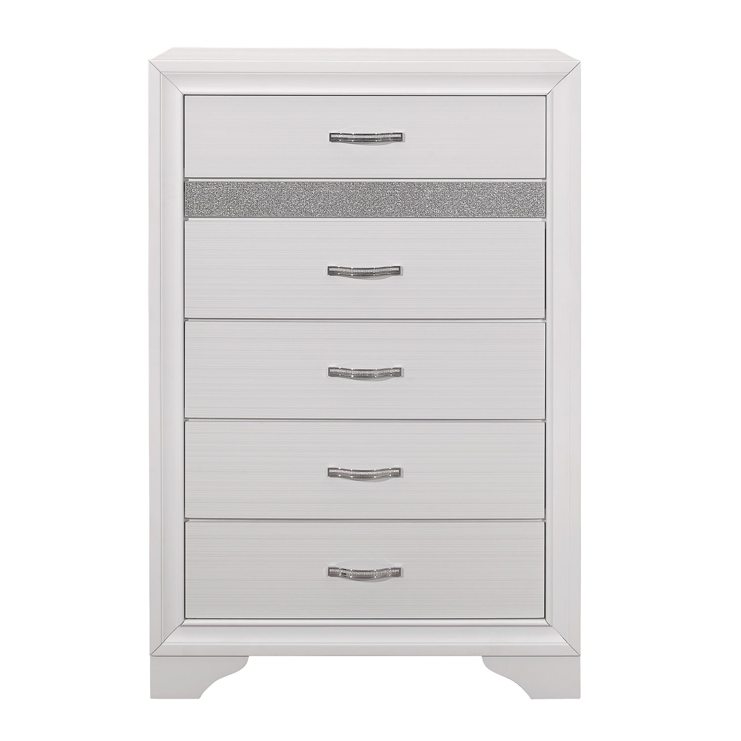 Your bedroom may be transformed into a luxurious retreat with the help of the luster collection's distinctive design. the embossed faux-wood veneer that covers the chest has been given a white finish, which enables the acrylic silver glitter that covers the front of the secret jewelry drawer to stand out. the interior of the jewelry drawer is lined with felt, which prevents damage to the objects you keep hidden away. the drawers' fronts are adorned with bar drawer pulls in polished chrome, which offer a contrast that complements the collection's overall appearance.