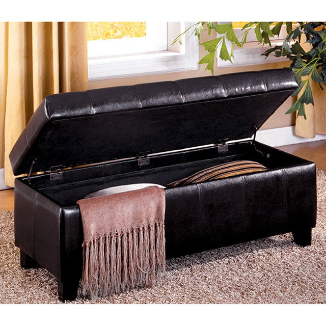 Perfect for storing extra blankets or magazines, this leatherette covered storage bench is convenient and stylish. Fully upholstered in espresso leatherette.
