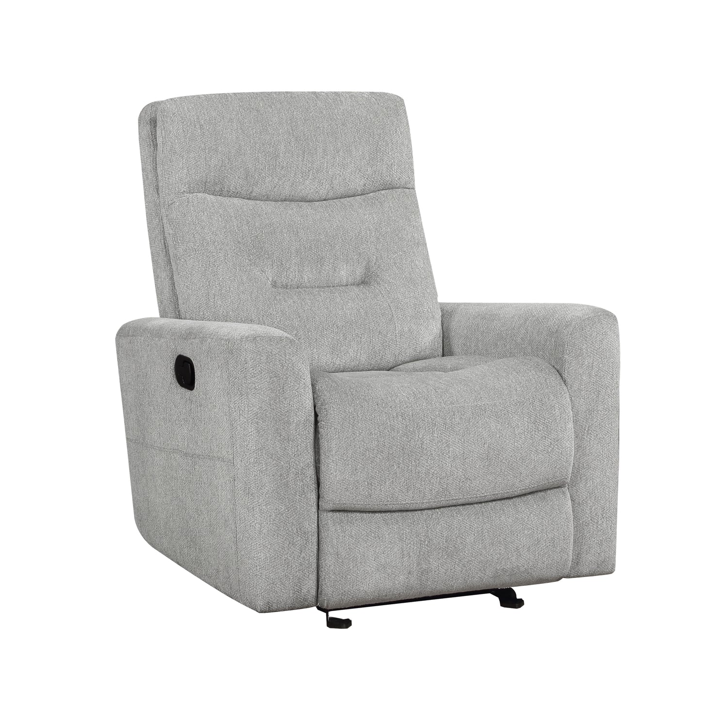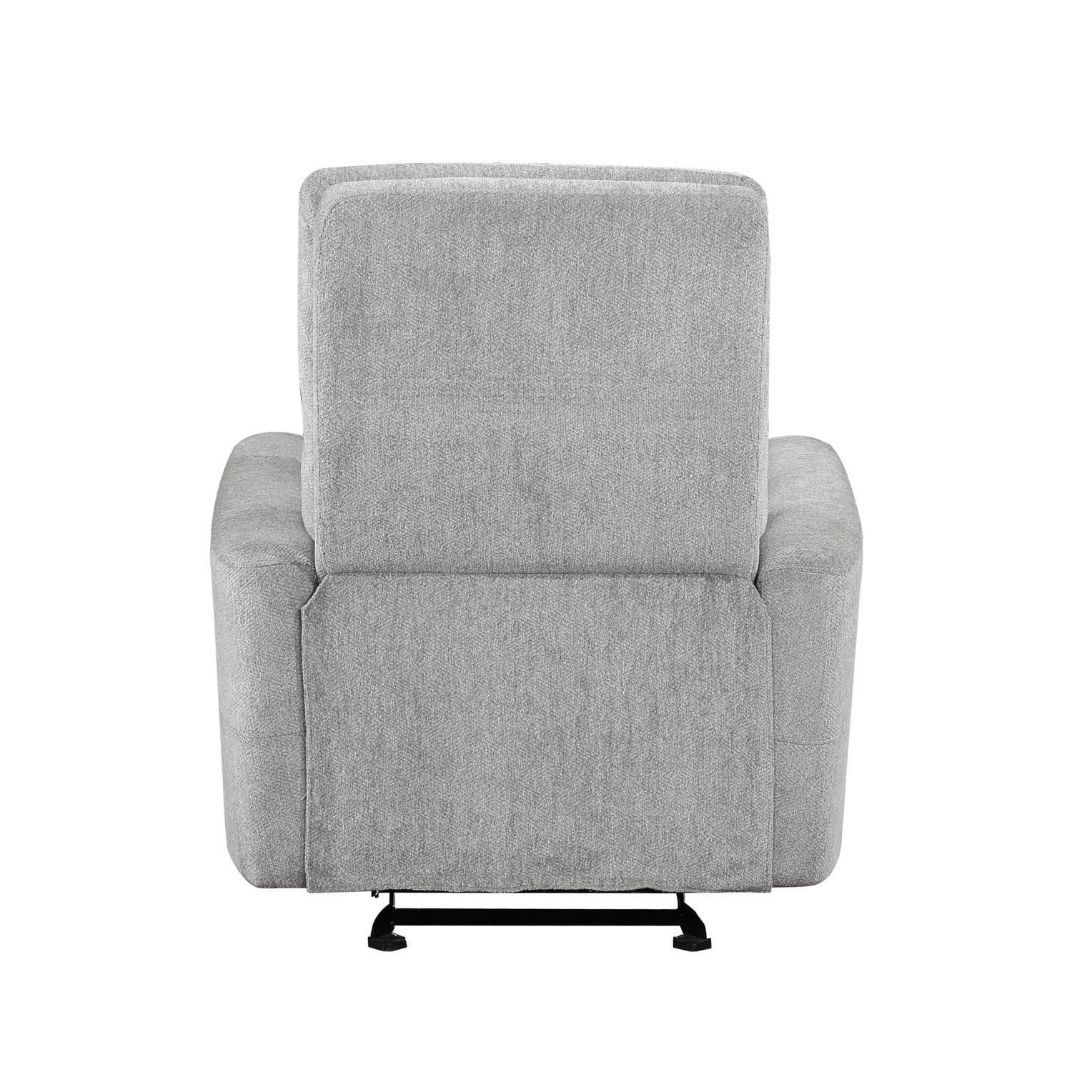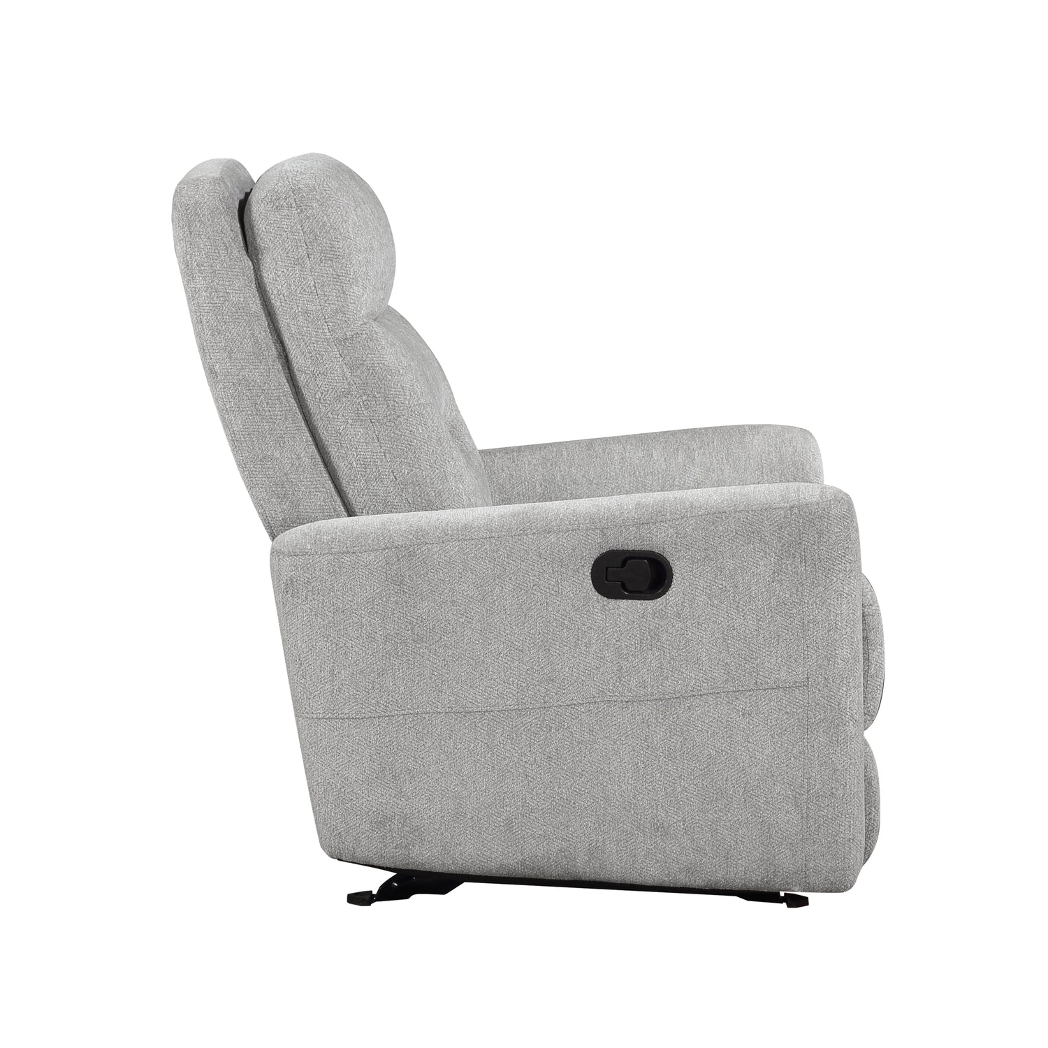 Your comfort is at hand in the design of the Lyndon Collection. The single reclining mechanism of the glider chair is engaged with a pull of the side-mounted tab. Gray chenille fabric upholstery covers the plush, subtle modern framing, furthering your comfort, and serving as a neutral palette for your living room décor.