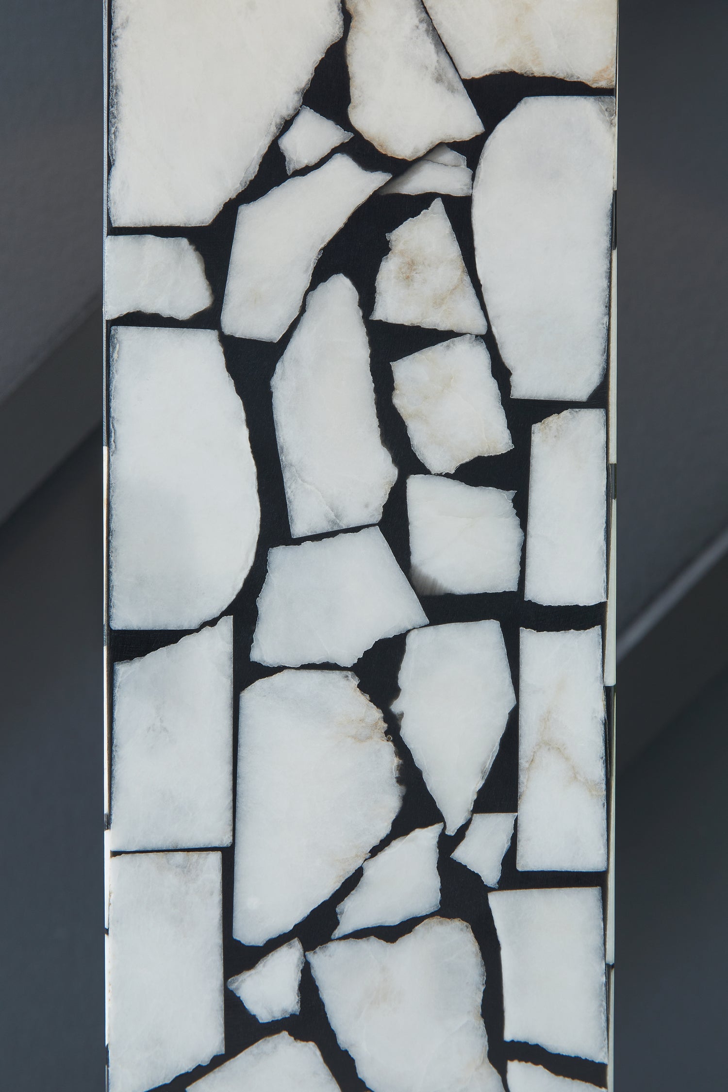 This exquisite table lamp is artfully adorned, with a mosaic pattern of white marble playing beautifully against a black background. Complemented by a modified drum shade for a sophisticated sensibility, the lamp casts an elegant glow in the entryway or living area.