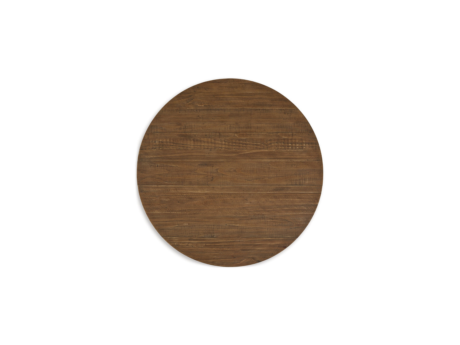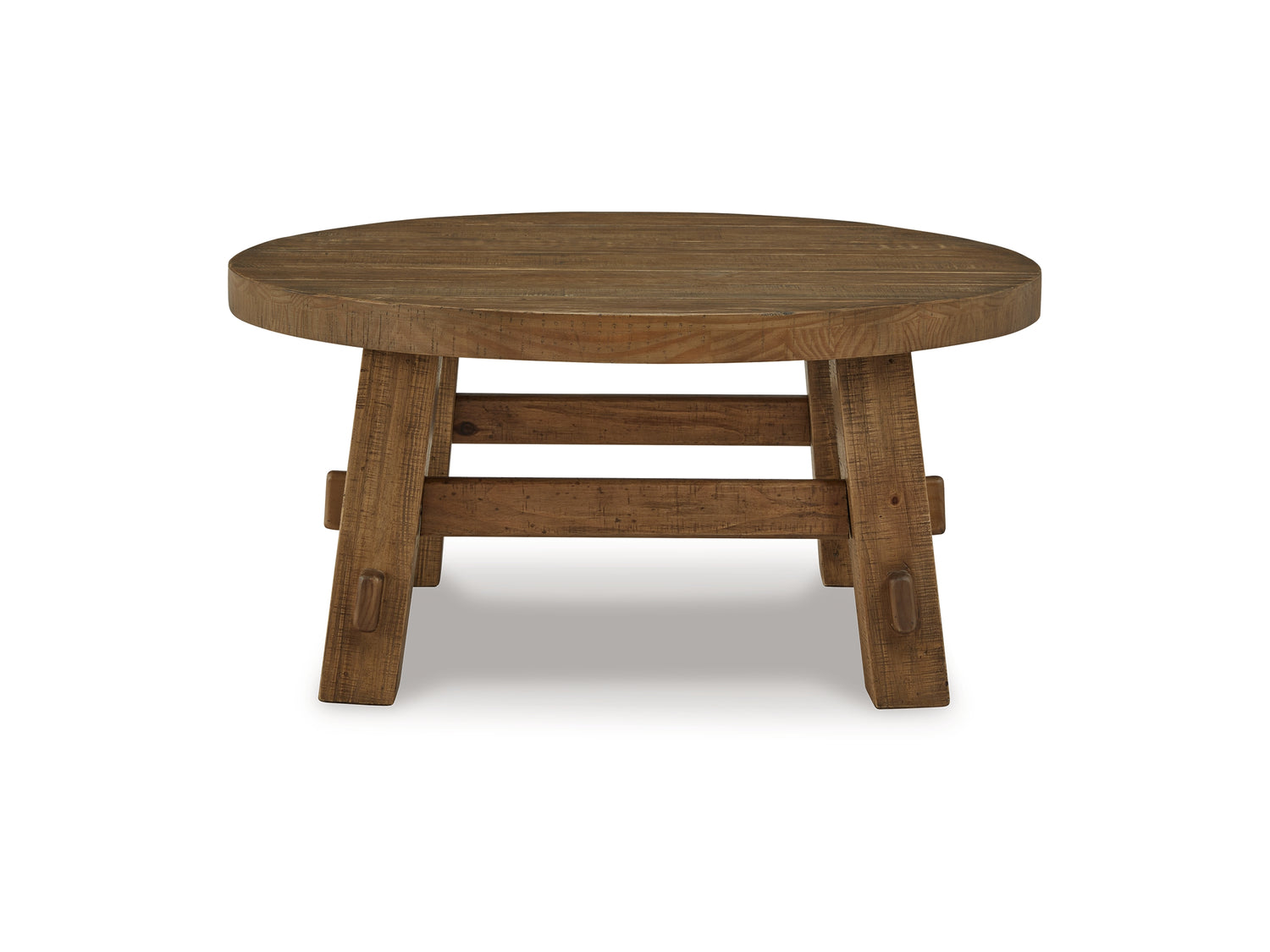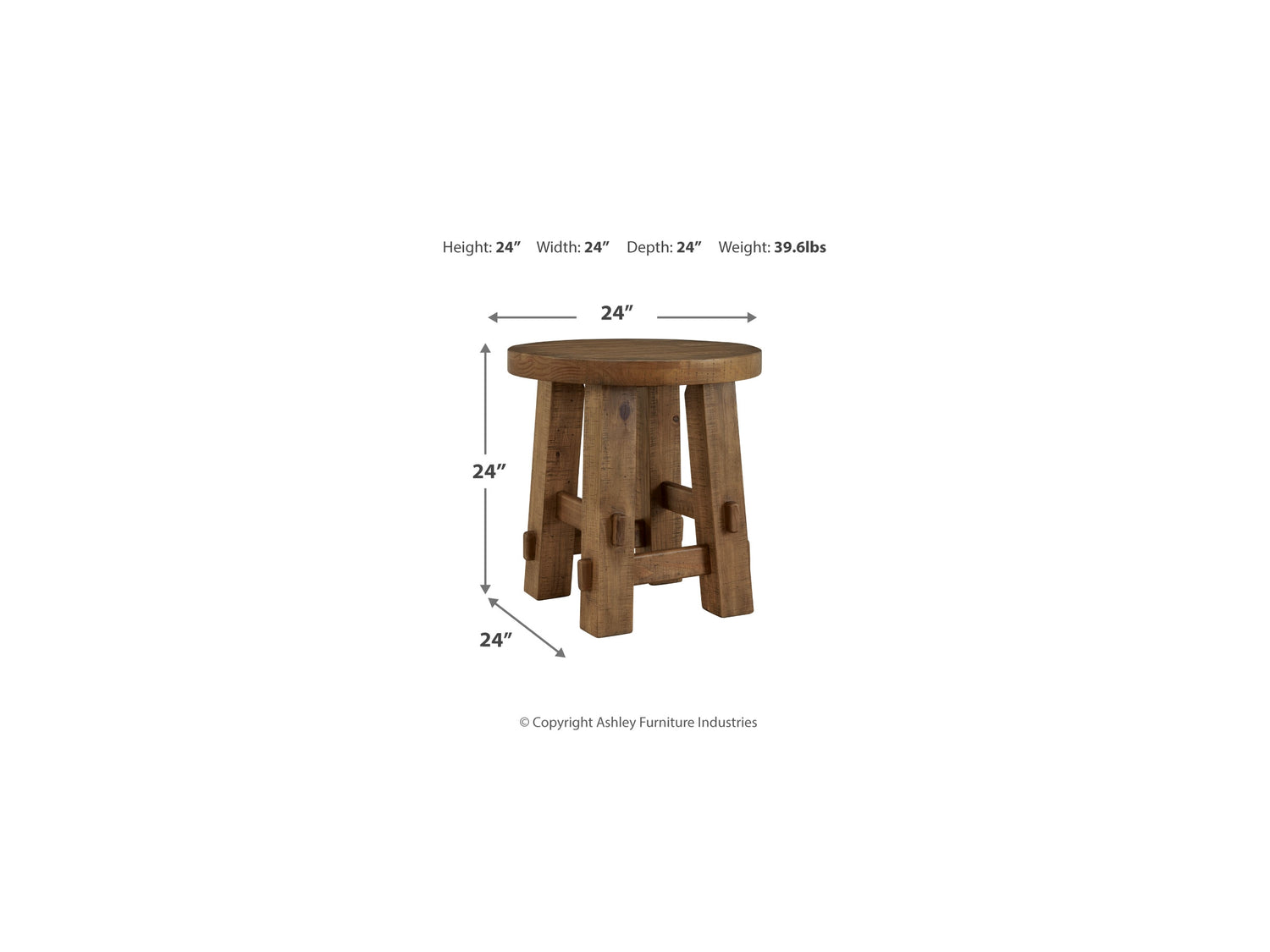 Series Features: Casual Rustic design. Made with thick distressed Pine solids. Finished in a warm brown wood tone with rubbed glaze to enhance the distressed wood textures. Craftsmen inspired post and beam base design. Thick round tops.