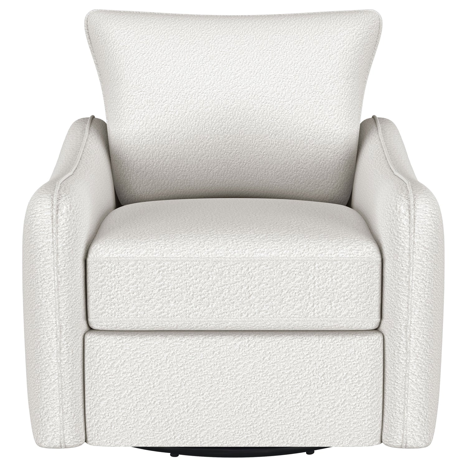 Nestled within the soft embrace of this bouclé upholstered chair, one finds a moment of tranquility. Its harmonious 360 swivel and glider functionality make each movement a fluid dance, a gentle invitation to unwind. The meticulously shaped arms, a testament to refined style, offer a restful perch for weary elbows. As the day's light fades, this chair becomes a cherished haven, its silhouette a blend of comfort and contemporary charm. In this cozy nook, time slows, and serenity takes a seat.