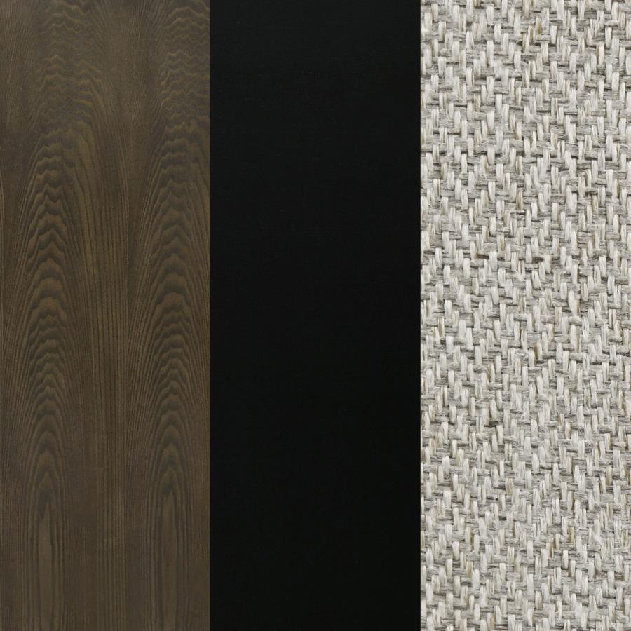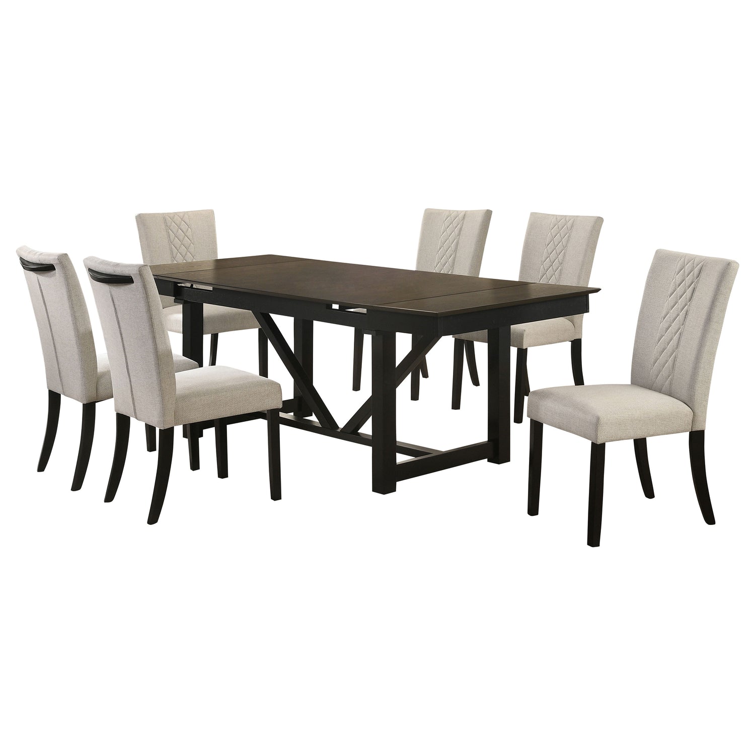 Bring transitional style to your dining room with this sleek and practical collection. The two-tone finish of the oak top and black trestle base complements any décor style, and the hidden pop-up extension leaves provide flexibility for hosting. The black transitional dining chair with beige upholstery, featuring a center strip of cross hatch design and a black wood embellished handle on the back, is the perfect complement to the table.
