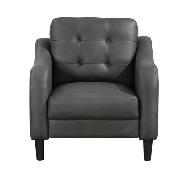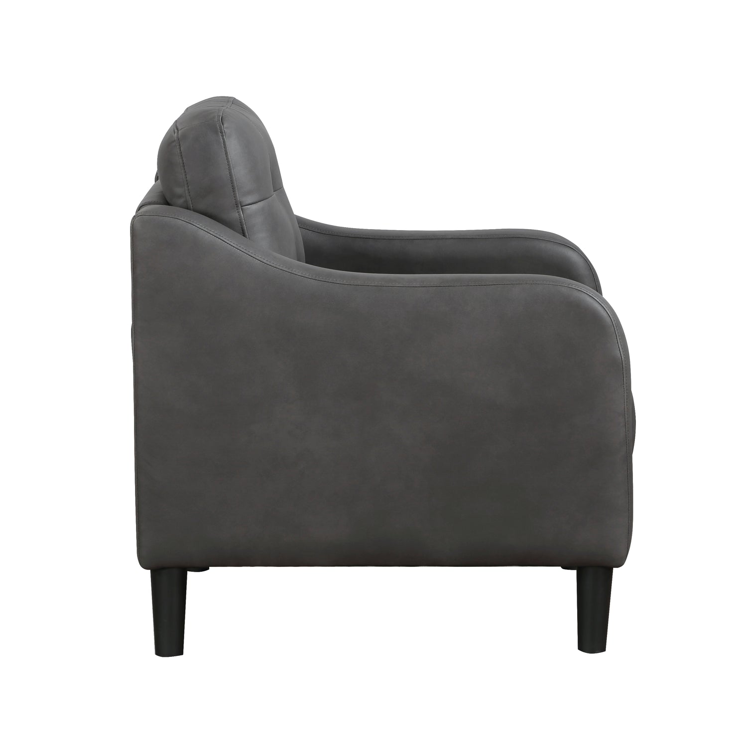 A versatile look for your casual living room comes in the form of the Mallory Collection. The button tufted seat back and contoured arms lend traditional accent to this transitional chair, with gray polished microfiber upholstery furthering the decorative versatility of the piece.