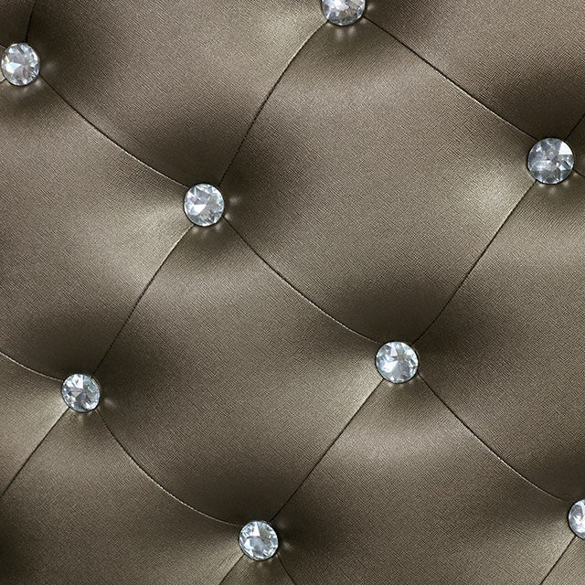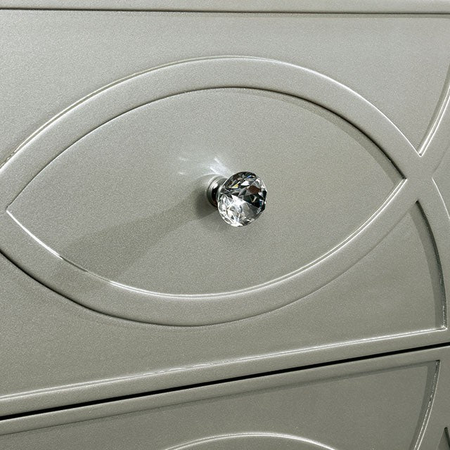 The glamor is in the details of this bedroom set from the Manar Collection. The headboard is upholstered in a faux leatherette, button-tufted with crystal-acrylic buttons, and embedded with a LED light, creating a sparkling aesthetic. The matching pieces feature a decorative, circular pattern, only adding to opulence of the design. Your bedroom will be a place to pamper yourself with this set.