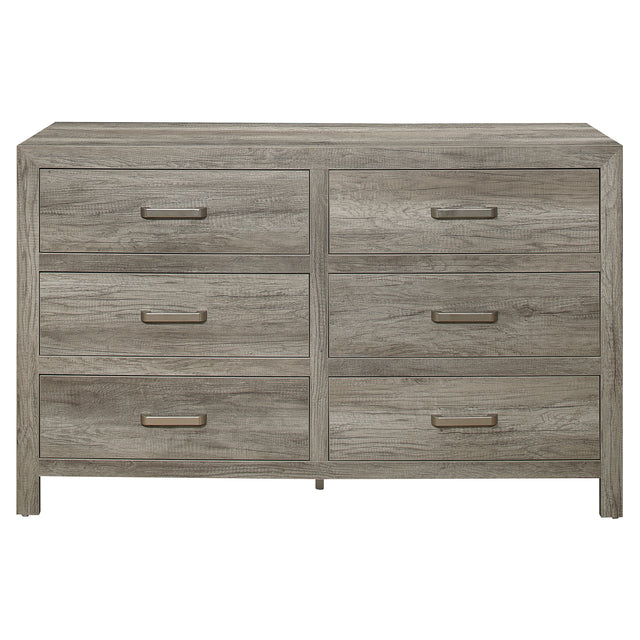 The mandan collection creates a one-of-a-kind offering for your bedroom by combining contemporary lines with a transitional style. the use of imitation wood veneer helps to create the appearance of genuine wood planks, and the gray finish adds even more of a weathered quality to the overall design. each drawer's front is finished with bar hardware in satin nickel, which provides a contrasting complement to the dresser.