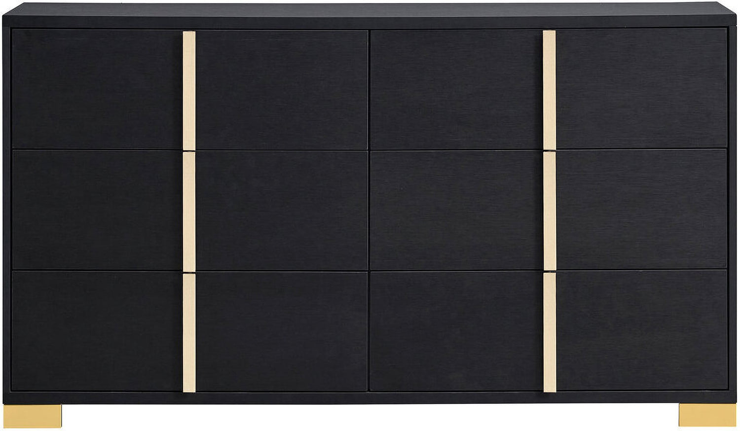 - Wood products construction with versatile finish and gold finish metal accents for geometric linear effect