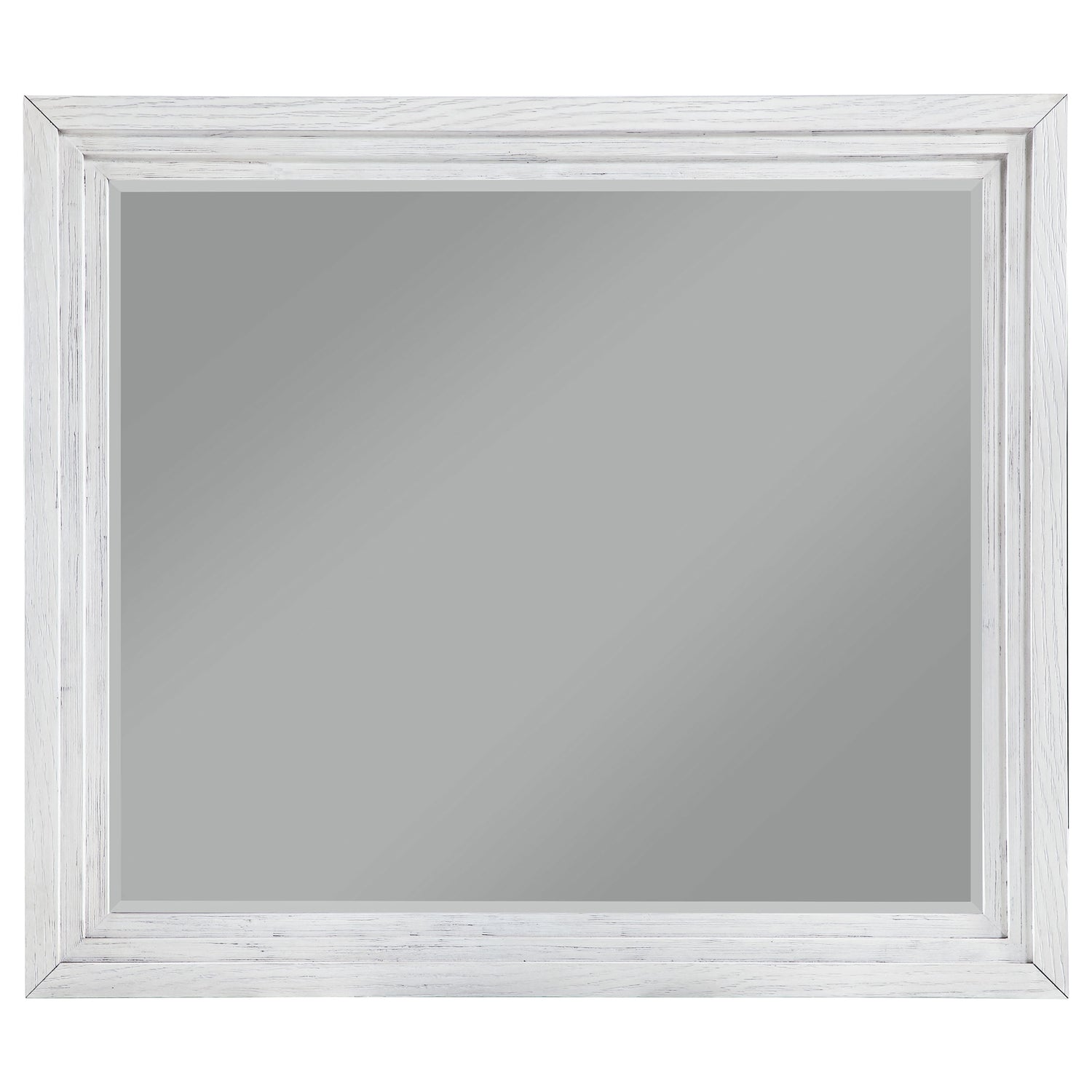 Embrace the fresh, contemporary style of a four-piece bedroom set. A distressed white finish highlights wood grain texture, while clean lines define the set with refined, inviting ambiance. The bed pairs a tall headboard and low footboard for an open profile, enhancing the modern appeal of this set. It includes a six-drawer dresser with a framed mirror, creating ample storage for clothing and linens. A two-drawer nightstand adds bedside storage and provides the perfect spot for a reading lamp or a vase of fresh flowers.