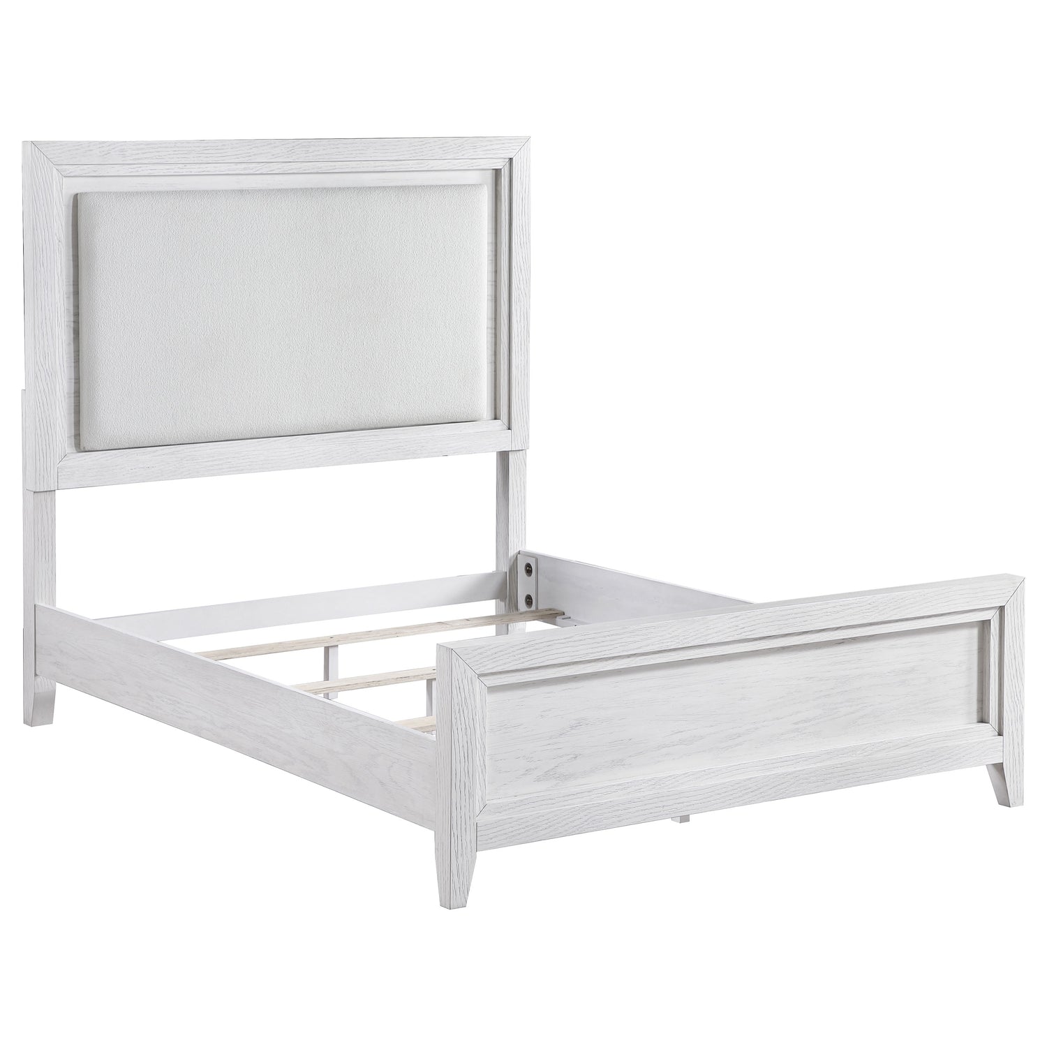 Embrace the fresh, contemporary style of a four-piece bedroom set. A distressed white finish highlights wood grain texture, while clean lines define the set with refined, inviting ambiance. The bed pairs a tall headboard and low footboard for an open profile adding to the modern appeal of this set. It includes a six-drawer dresser with a framed mirror, creating ample storage for clothing and linens. A two-drawer nightstand adds bedside storage and provides the perfect spot for a reading lamp or a vase of fresh flowers.