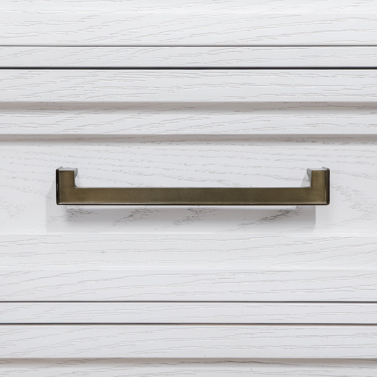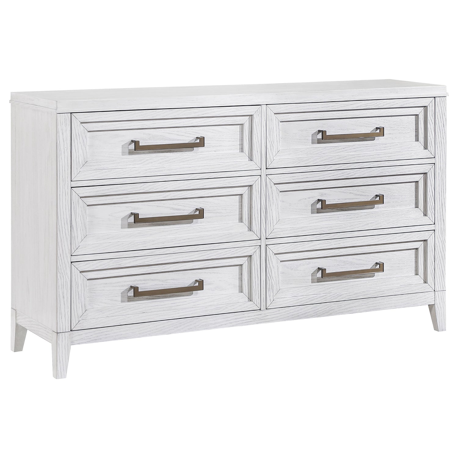 Distinctive hardware and layered trim work create a refined but dimensional effect for a five-piece modern bedroom set. In distressed white with wood grain texturing, it's a complete set that includes an upholstered bed with a padded headboard, two-drawer nightstand, five-drawer chest, and six-drawer dresser and mirror. It delivers ample storage and easy organization in a cohesive bedroom ensemble. The bed features a contemporary, open silhouette with a tall headboard and low footboard. Add colorful linens for a fresh look or stick with crisp white for a soothing monochromatic effect.